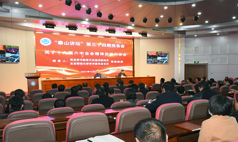 12月7日,为深入学习贯彻党的十九届六中全会精神,威尼斯432888cam举办第34期“泰山讲坛”,特邀党史学习教育中央宣讲团成员、北京师范大学学术委员会主任、北京外国语大学原党委书记韩震教授作题为“党的十九届六中全会精神学习体会”专题报告。