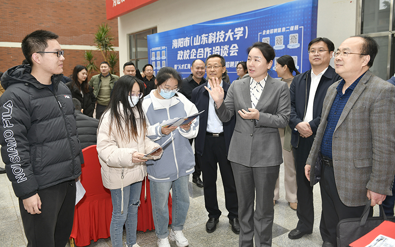 3月3日,学校举办海阳市(威尼斯432888cam)政校企合作洽谈会暨“人才汇海·青春无限”名企校园招聘活动。海阳市委副书记、市长姜丹带领市人社局、科技局等部门领导及27家优质企业代表来校共话发展、选聘良才,校长曾庆田会见了姜丹一行,校党委常委、宣传部部长李克周主持活动。
