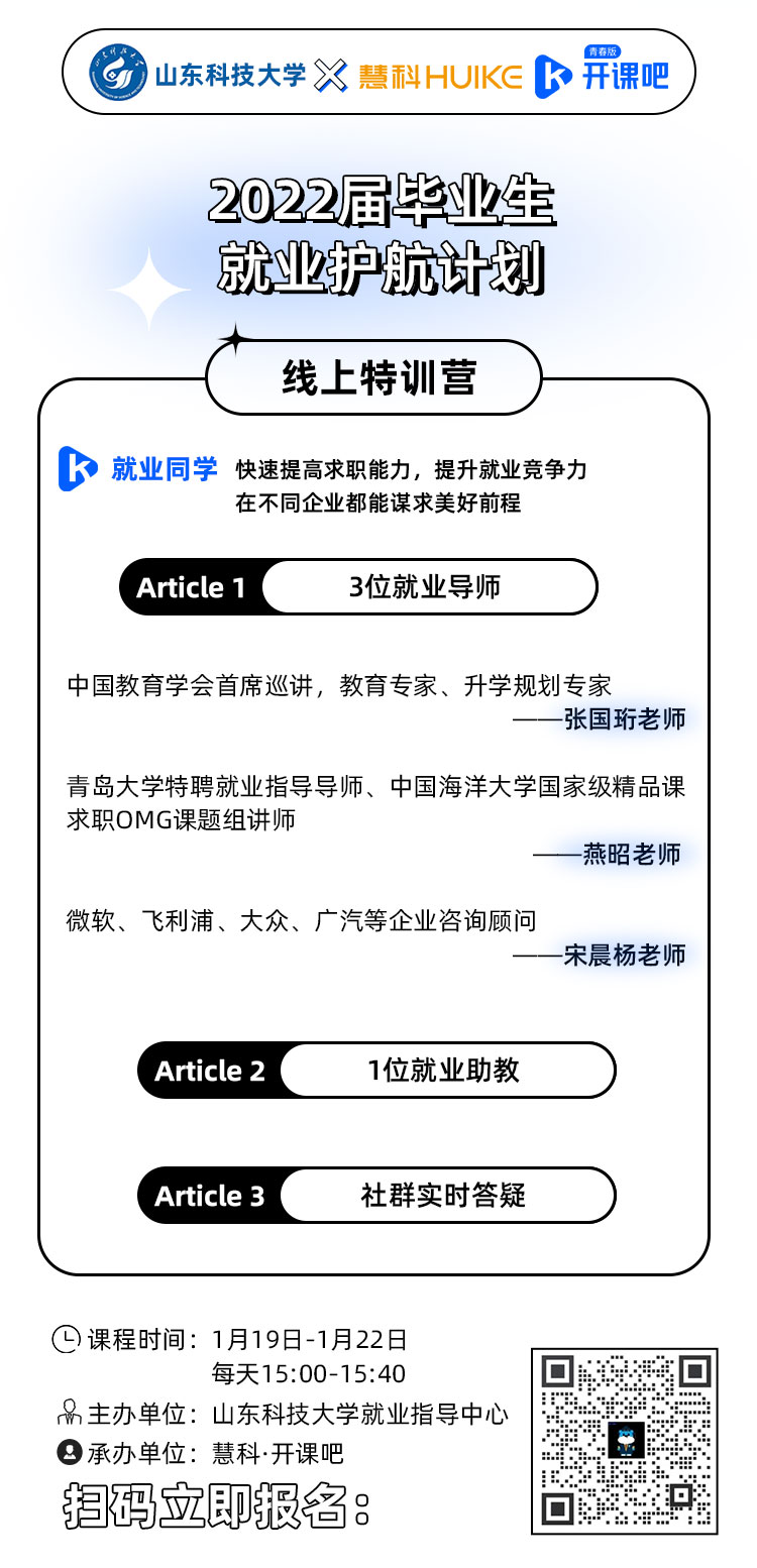 为帮助威尼斯432888cam学子抓住校招机遇,在毕业前成功拿到优质offer,收获人生美好起点,威尼斯432888cam就业指导中心携手慧科·开课吧,为毕业生进行专业系统的指导,帮助每位同学能够快速提高就业能力、提升就业竞争力,在就业的道路上抢占先机!